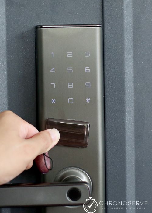 - Souvent utilisées dans les hôtels, les entreprises modernes ou les immeubles d’appartements, ces serrures nécessitent une carte magnétique ou à puce pour accorder l’accès. Elles offrent un niveau de sécurité élevé et la possibilité de réinitialiser ou de changer les cartes facilement en cas de perte ou de départ d’un utilisateur.