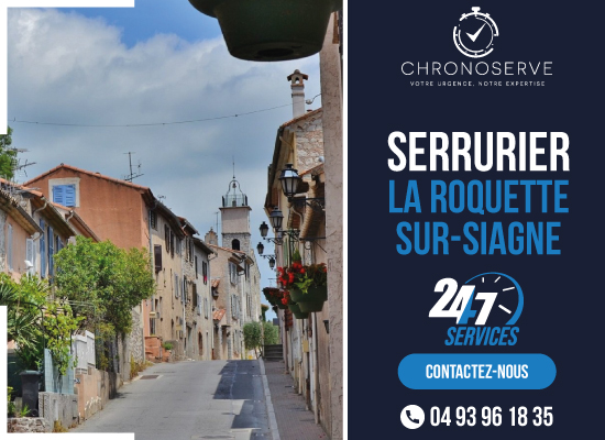 Ne restez pas bloqué dehors ! ChronoServe Serrurier La Roquette-sur-Siagne intervient 24H/24 et 7J/7 en moins de 30 minutes pour vous dépanner.